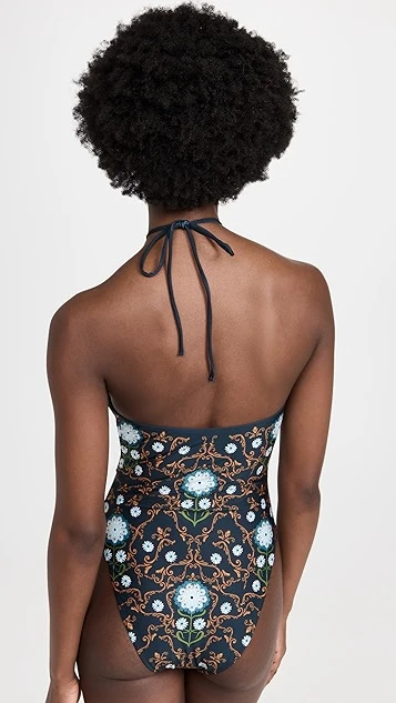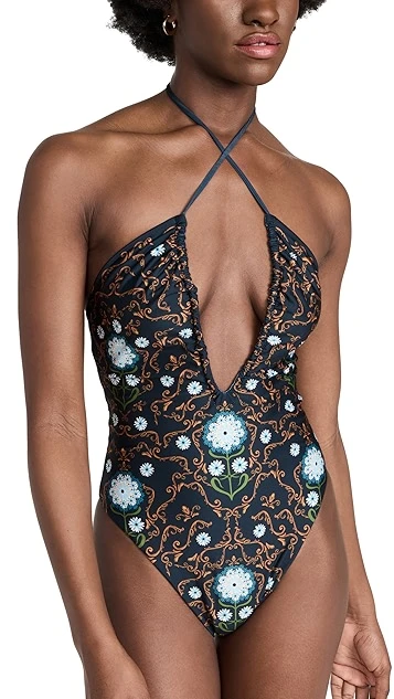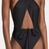 - Plunging neckline with halter ties