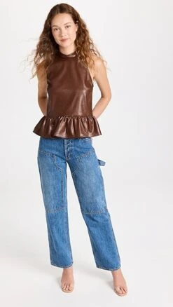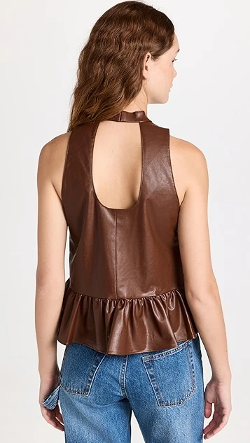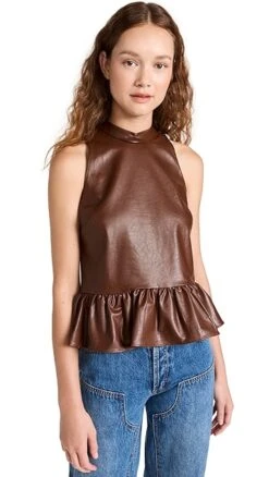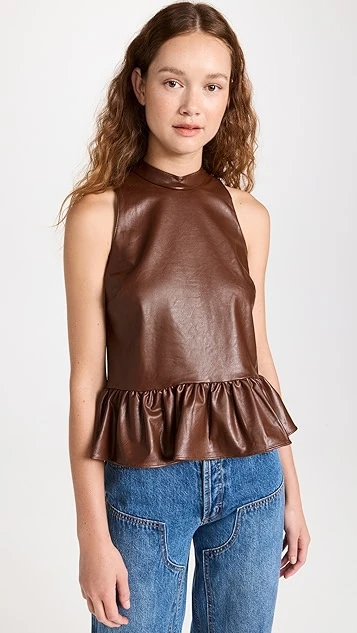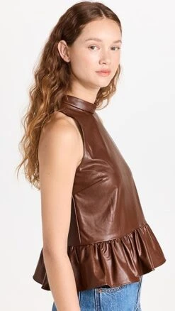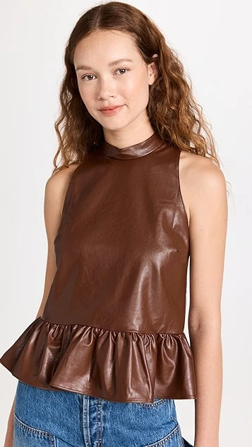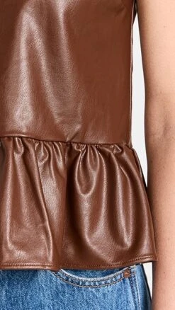 Dark-brown faux leather composes this polished peplum top from Amanda Uprichard. Dress this piece up with trousers, or keep things casual in your favorite jeans.