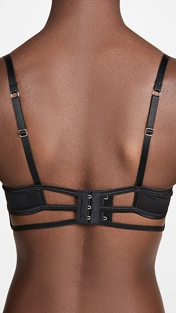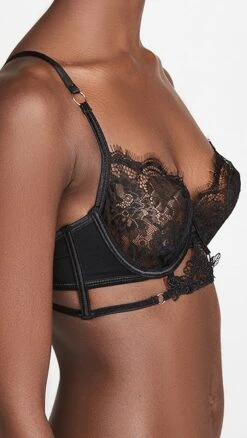 Sheer black lace and a unique cutout design create romantic allure for this Bluebella bra. Wear it with the label’s matching thong to complete the set.