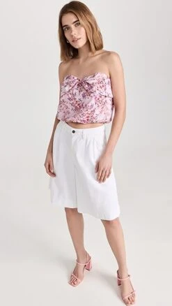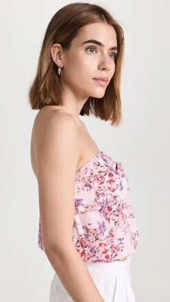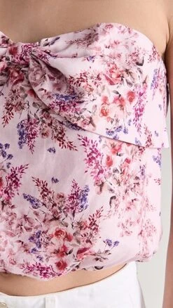 A strapless CAMI NYC top with an allover floral print, featuring a subtle bow at the bodice. Jeans, trousers, and slip skirts will all work equally nicely with this piece.