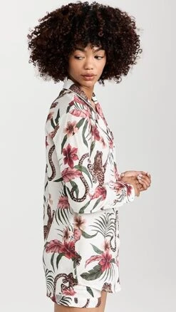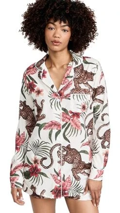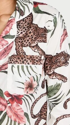 A striking jungle motif distinguishes this Desmond & Dempsey pajama set, which is crafted from pure cotton fabric and styled with notched lapels for a classic look.