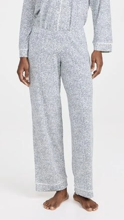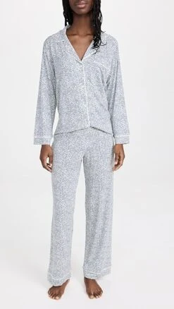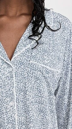 A printed Eberjey pajama set, styled in soft jersey and trimmed with contrast piping for a sweet, vintage-inspired touch. A notched collar accents the buttoned placket on the long-sleeved top.