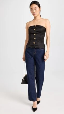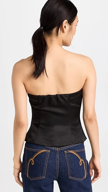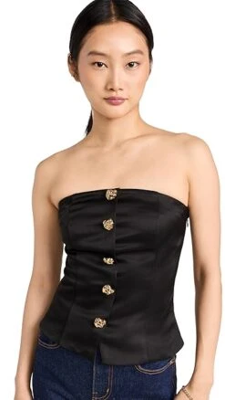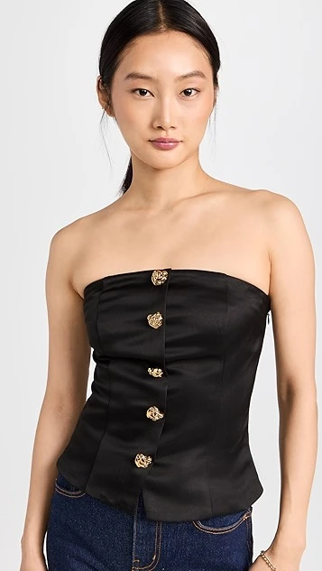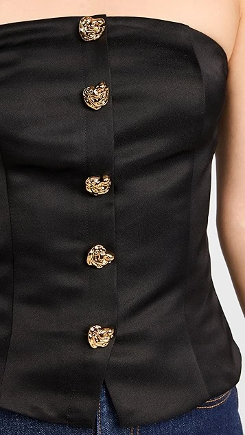 A strapless endless rose top in silky suiting, featuring a corset-style fit and an arrangement of decorative gold-tone buttons. Lean into the polished feel of this piece by pairing it with trousers, or take things in a more casual direction with your favorite jeans.
