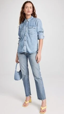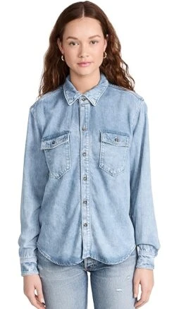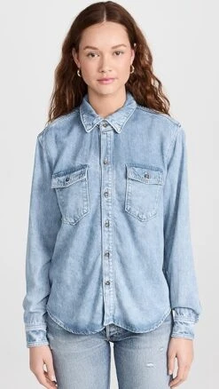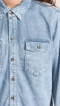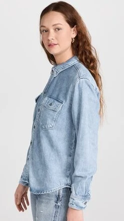 Lightweight and softened denim-like fabric composes this faded, weekend-ready Good American shirt. To complete your outfit, just add a pair of jeans from the label’s collection and your favorite sneakers.