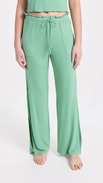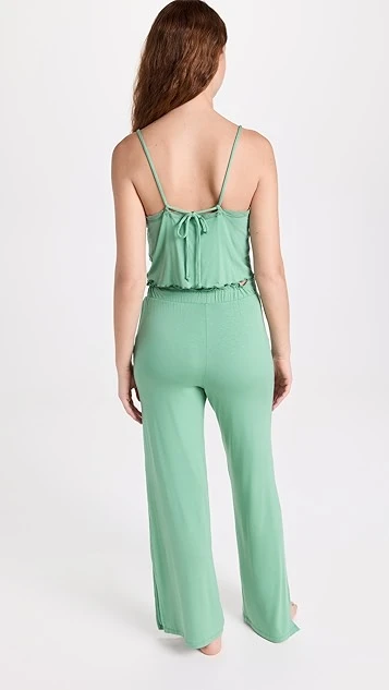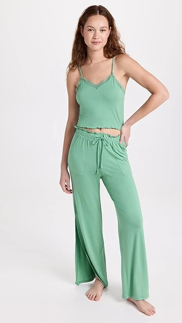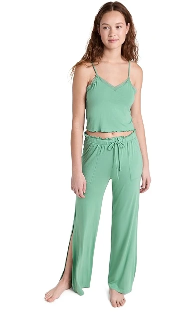 A comfy Honeydew Intimates pajama set with a number of subtle unique touches, like tonal lace at the neckline of the cami top and deep slits at the cuffs.