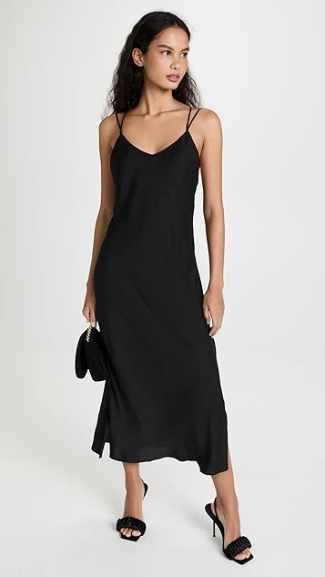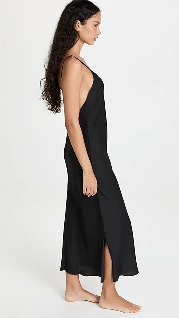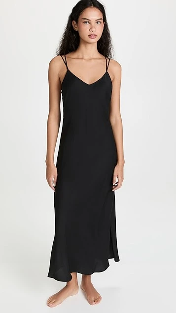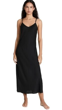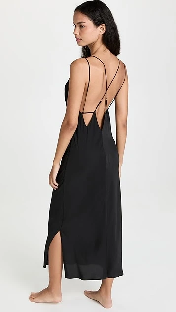 A minimalist Honeydew Intimates black dress in silky fabric, given a touch of elegant, delicate style with crisscross back straps.