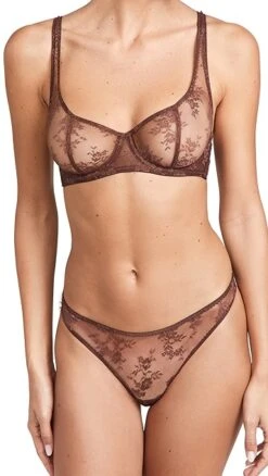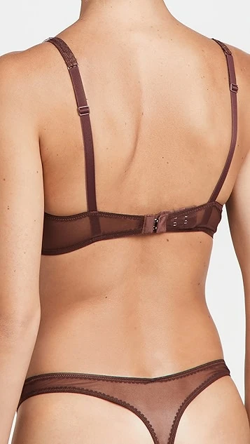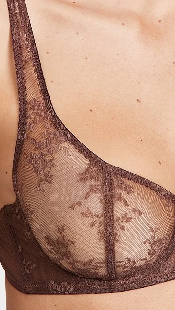 A darkly colored Journelle bra in fine mesh, accented with subtle touches of floral lace.
