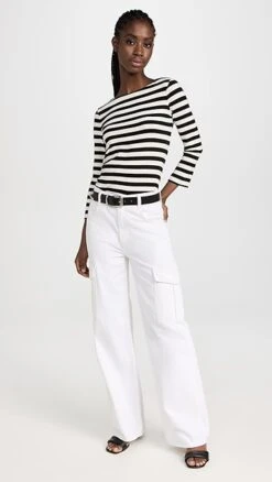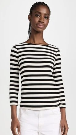 A chic weekend classic, this L’AGENCE long sleeve tee features a boat neckline and wide, two tone stripes. Keep your look polished by pairing this piece with white jeans or trousers.