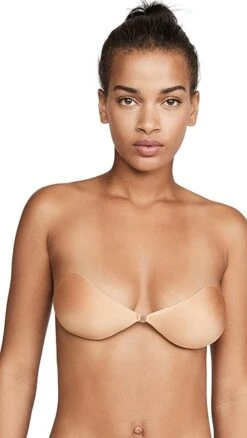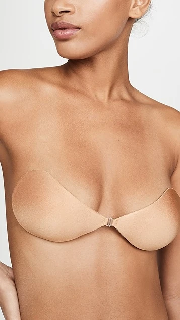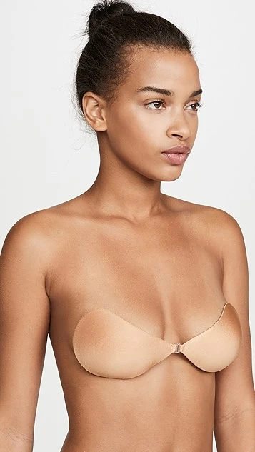 A backless, strapless, seamless, self-adhesive half-cup bra. The unique design provides maximum support and cleavage without binding bra straps. Each bra is reusable, and adheres to the skin with silicone adhesive. Apply each side, then connect with the clasp in the middle.