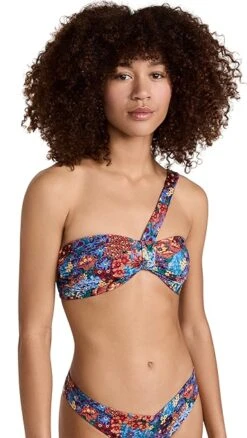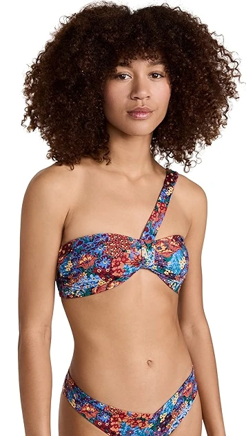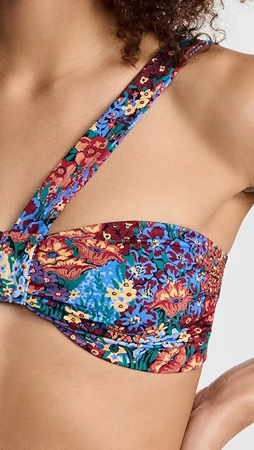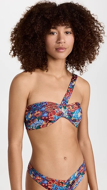 This Onia bikini top features a one-shoulder neckline, a bandeau bodice, and a strikingly colored floral print.