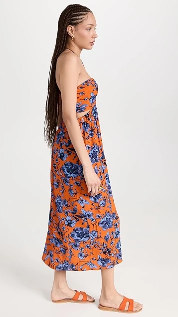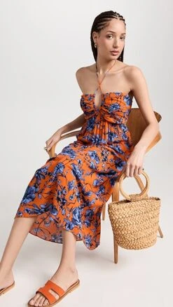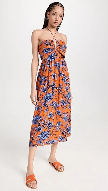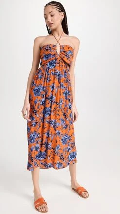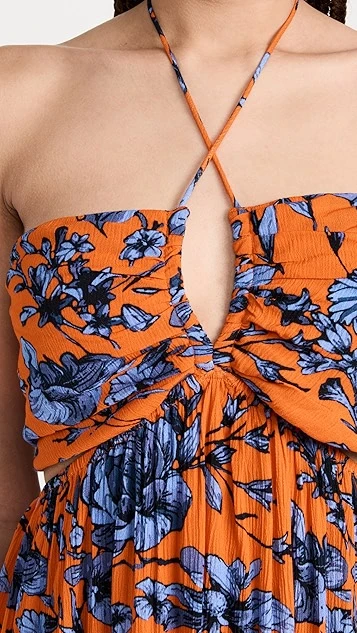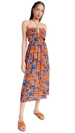 Blazing orange and deep blue tones lend an eye-catching look to this Playa Lucila cover up dress, which is designed with a slender halter neckline. A wraparound cutout adds a touch of extra emphasis to the waist.