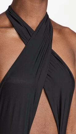 This PQ Swim swimsuit showcases a unique silhouette, featuring a crisscross halter neck that creates an alluring open back, while attached ties cinch the waist.