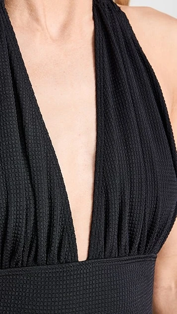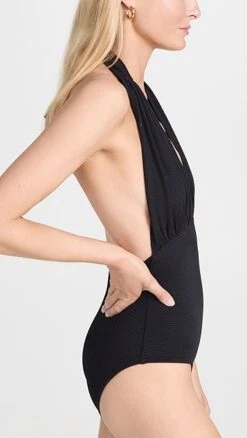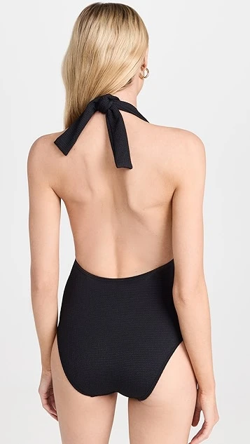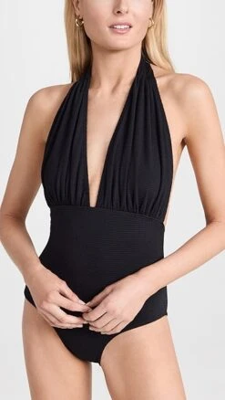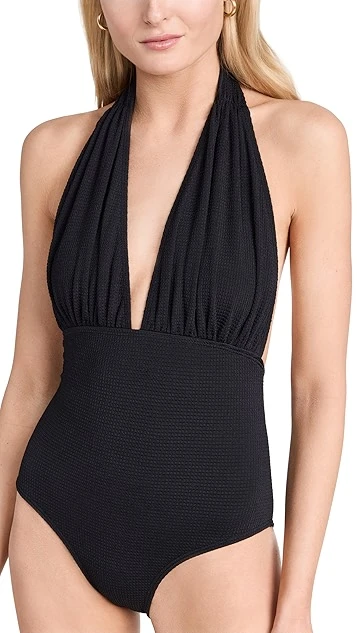 Timelessly chic, this black Shoshanna one-piece swimsuit features texture-rich fabric, a deep halter neckline, and fluid pleats.