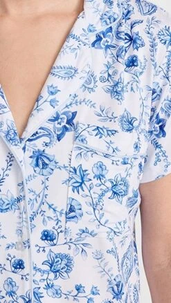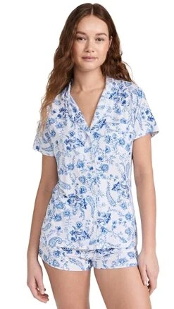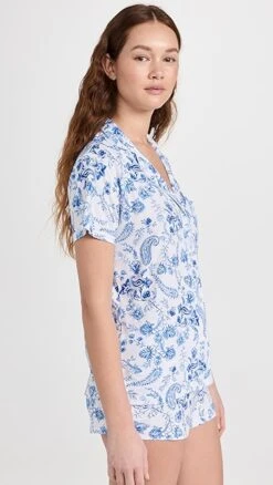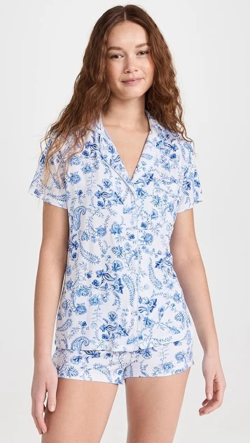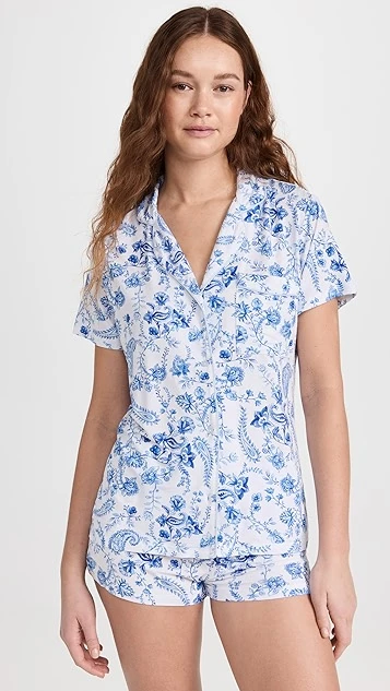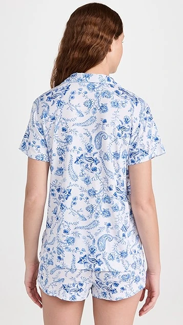 A charming pair of Stripe & Stare short sleeve pajamas in extra-soft modal jersey, designed with classic notched lapels and detailed with a blue-hued paisley print.