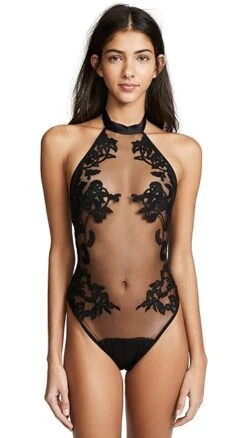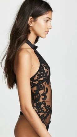 This sheer-mesh Thistle & Spire bodysuit is designed with satiny halter ties and accented with touches of romantic guipure lace.