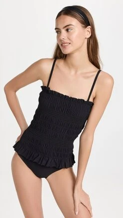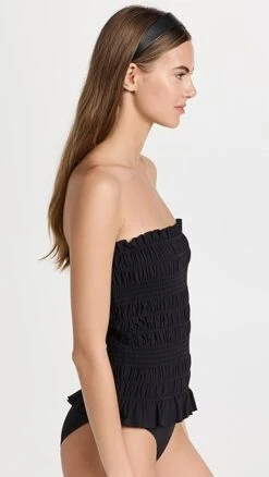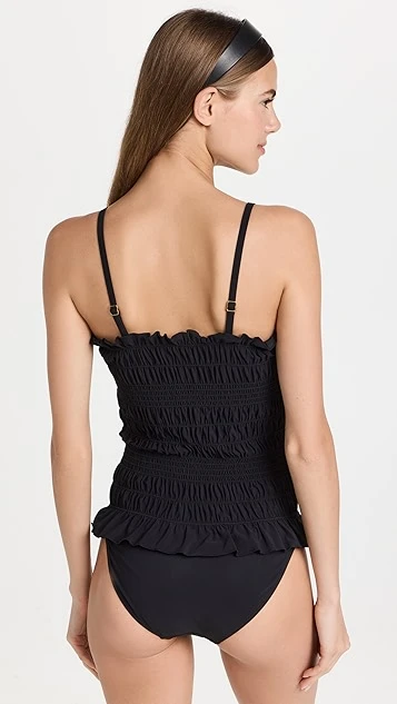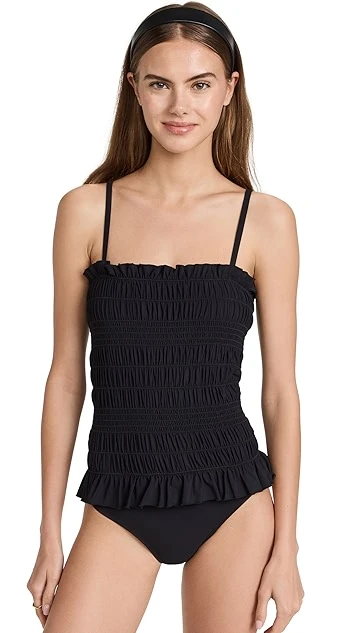 The ever-popular Costa silhouette in a figure-flattering one piece. This Tory Burch swimsuit adds charming, vintage-inspired detailing to a classic black suit.