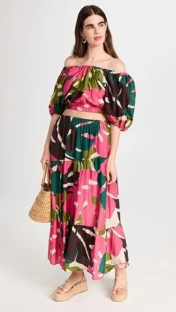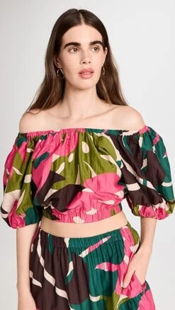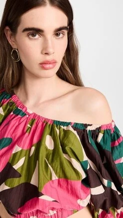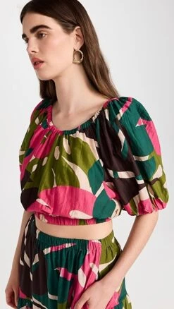 A Velvet off-shoulder top with a voluminous fit, patterned with a unique mixture of light and dark tones. Keep your look coordinated with the label’s matching skirt, or take things in a casual direction with jean shorts.