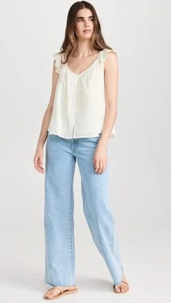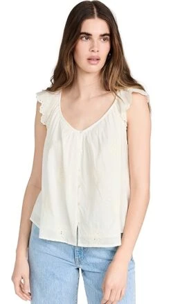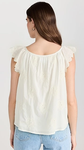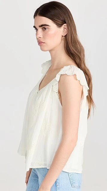 A sweet and simple Velvet blouse, detailed with subtle eyelets and tonal embroidery. Fluttery ruffles accent the shoulders, and the deep V neckline adds to the timeless feel of the piece.